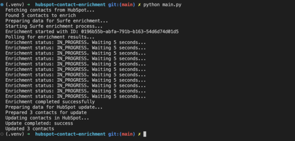 - Ensure your .env file contains your Surfe API key and your HubSpot private app access token: