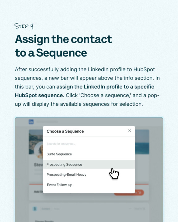 Surfe makes enrolling contacts in HubSpot sequences simple and efficient. You can do it directly from LinkedIn. Just connect your HubSpot account to Surfe, open the Surfe sidebar, and toggle sequences on. From there, you can assign prospects to specific HubSpot sequences without leaving LinkedIn. This integration saves you time and keeps your outreach process smooth and effective.