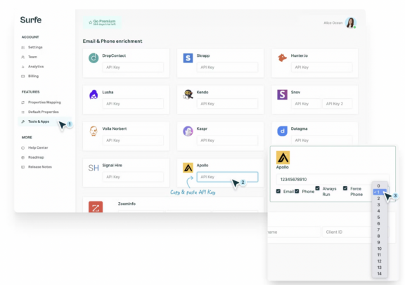 It’s not like other email finders – most just have a database that of old email addresses that they check – because it uses an intelligent cascade technology to combine the power of the top email finder tools globally. So instead of needing a subscription to Apollo, Dropcontact, RocketReach, or Hunter, you actually just get native access to all of those, right inside LinkedIn, through one subscription to Surfe. You can actually add up to 15 tools too thanks to the ability to plug extra email finders into the cascade via API.