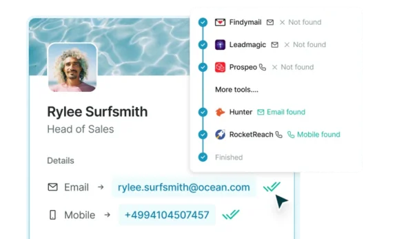 Surfe’s uses clever waterfall enrichment technology, which means it aggregates the data from multiple premium providers to find you exactly what you need. Basically, it cycles through each provider (starting with the one most likely to have the right data) until it finds a phone number or email address that looks promising. It then checks and double-checks this data, runs emails through ZeroBounce, and, once it’s confident everything is accurate, passes it over to you.