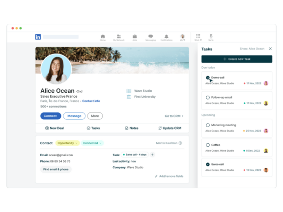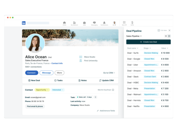 Our next-level product will provide you with simple, flowy and cross-channel experience, overlaying browsers and every website you visit. Surfe treats the CRM as a database and brings your workflow and relationship management to the next level. Plus, we’re introducing the first dashboard on top of all the others.We call it the surfboard.